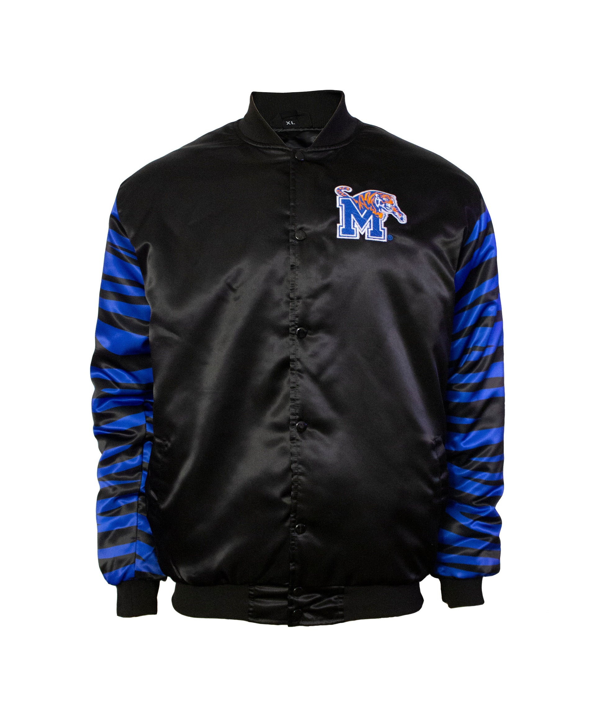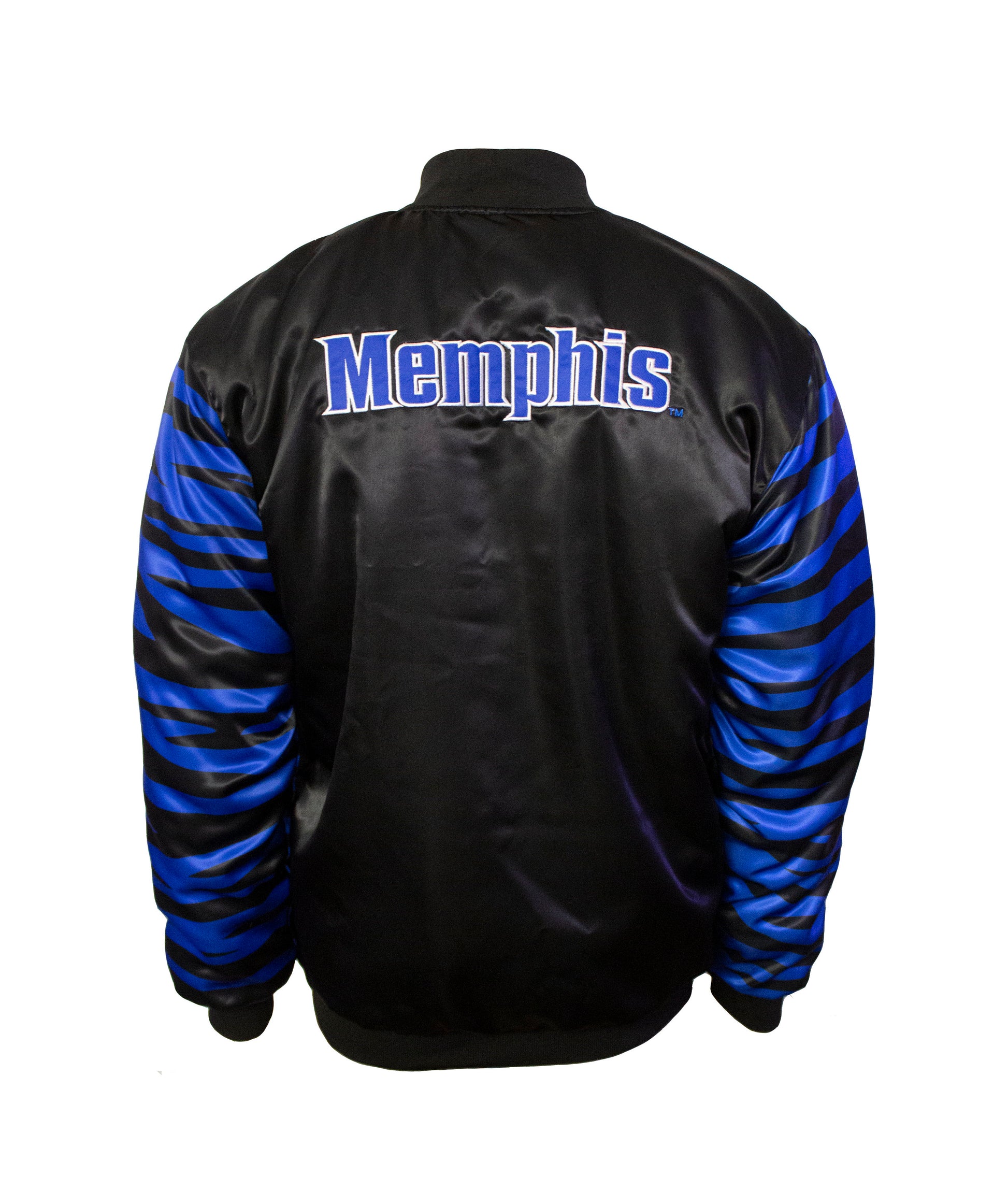 -Shiny Satin fabric, Sublimated blue and black tiger stripe pattern sleeves, Tackle Twill "MEMPHIS" on the back, Memphis embroidered logo on chest