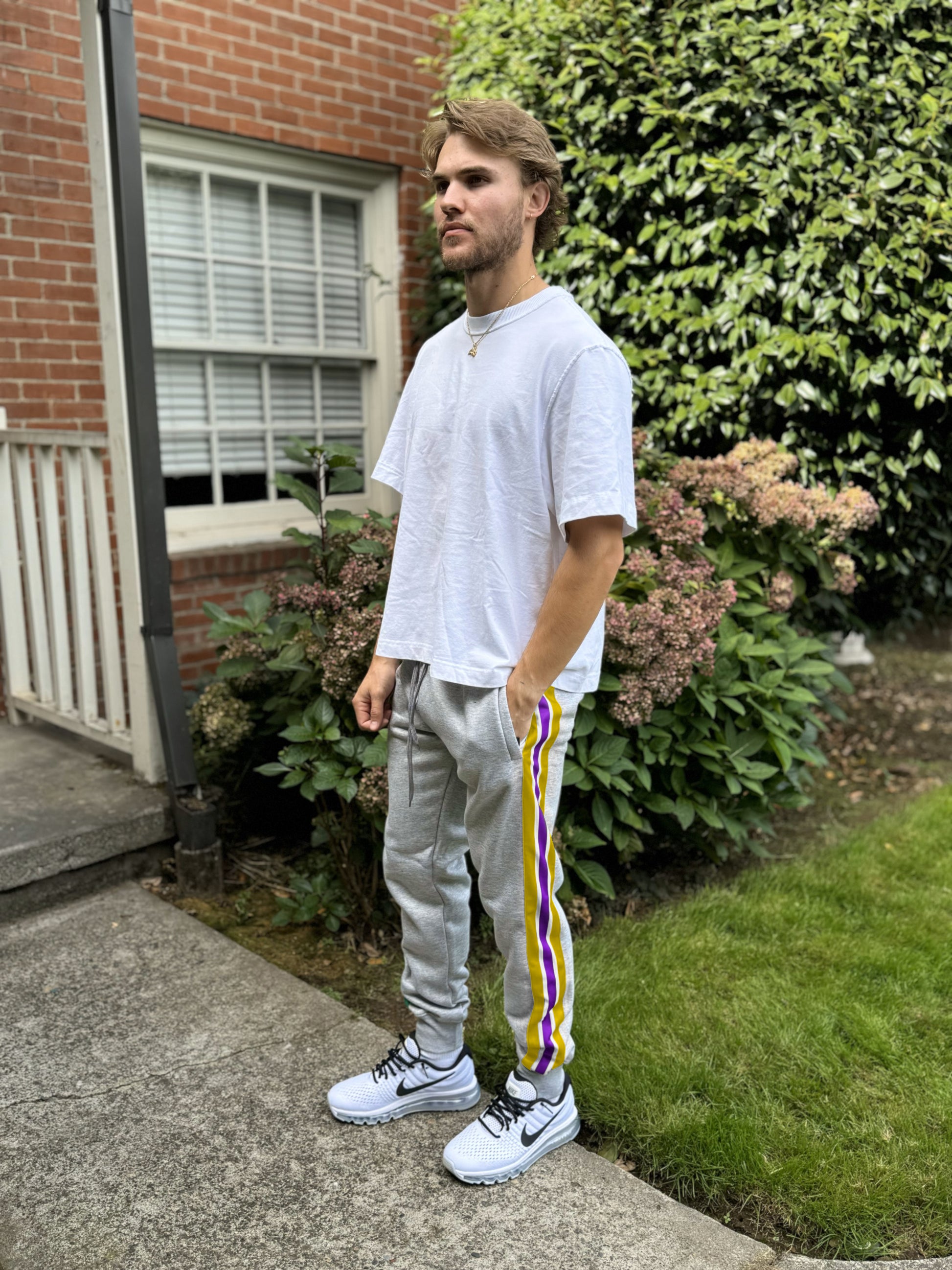 Men's Side Striped Fleece Jogger Pant (Gray with Gold / Purple / White Stripes)