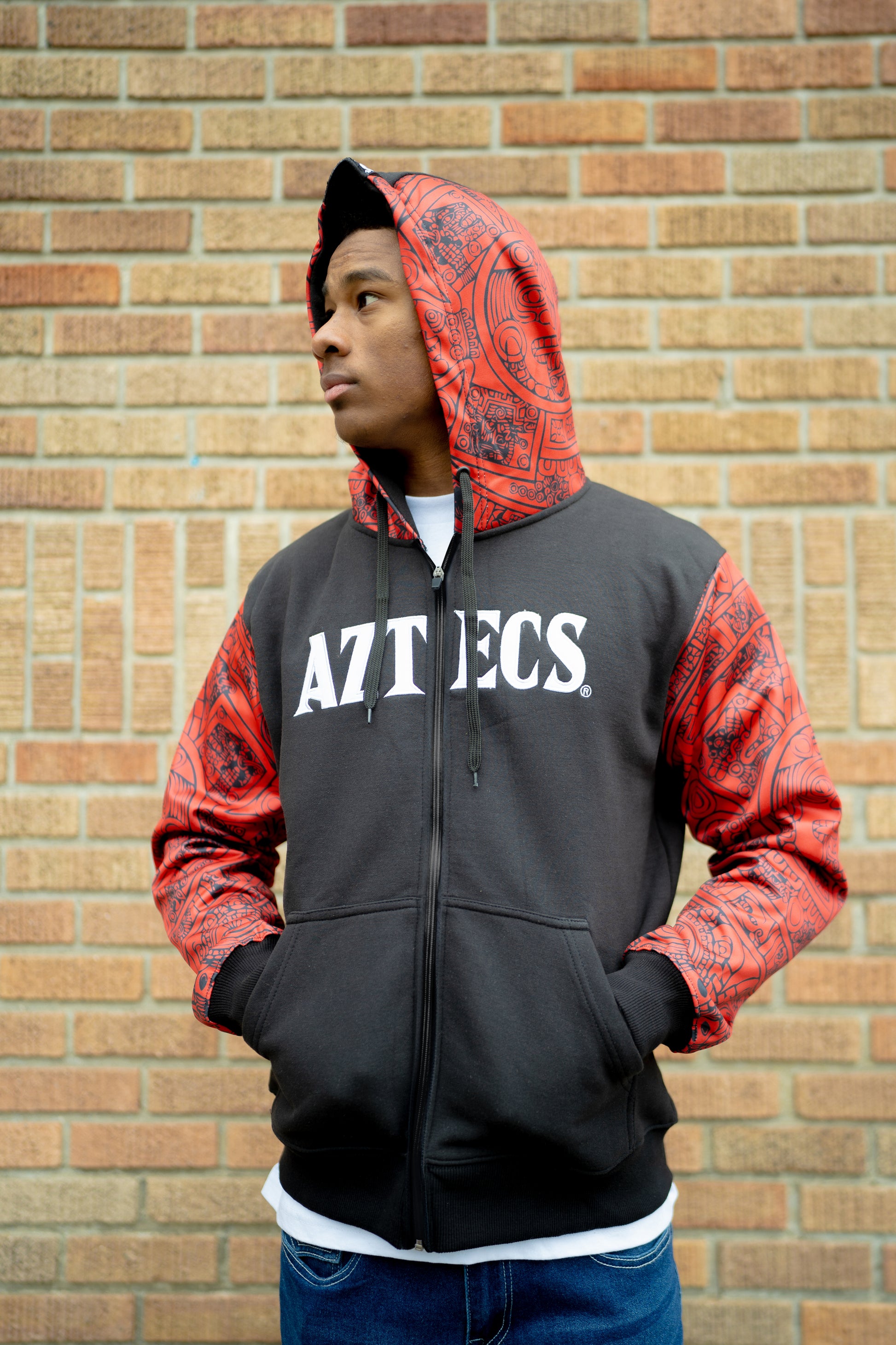 Aztec calendar pattern digitally printed on the sleeves and hood