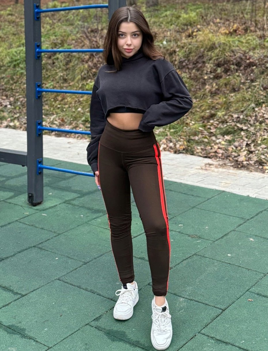 -4-way stretch fabric for optimal mobility -Sewn on fabric stripes on both leg sides -The main legging color is brown. The side stripes are orange and brown.