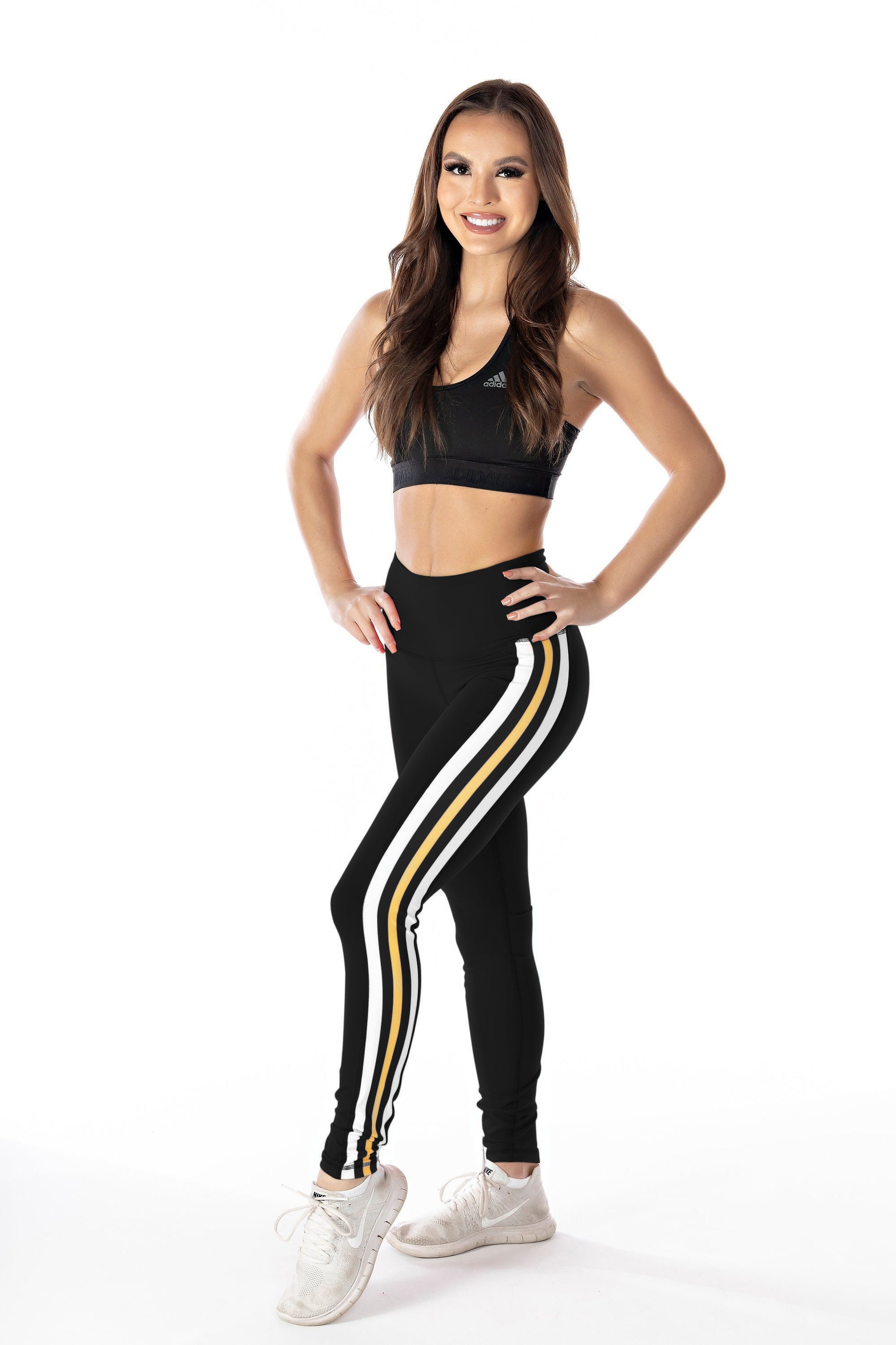 -4-way stretch fabric for optimal mobility -Side stripes digitally printed on both leg sides -The main legging color is black. The side stripes are white, black, and gold